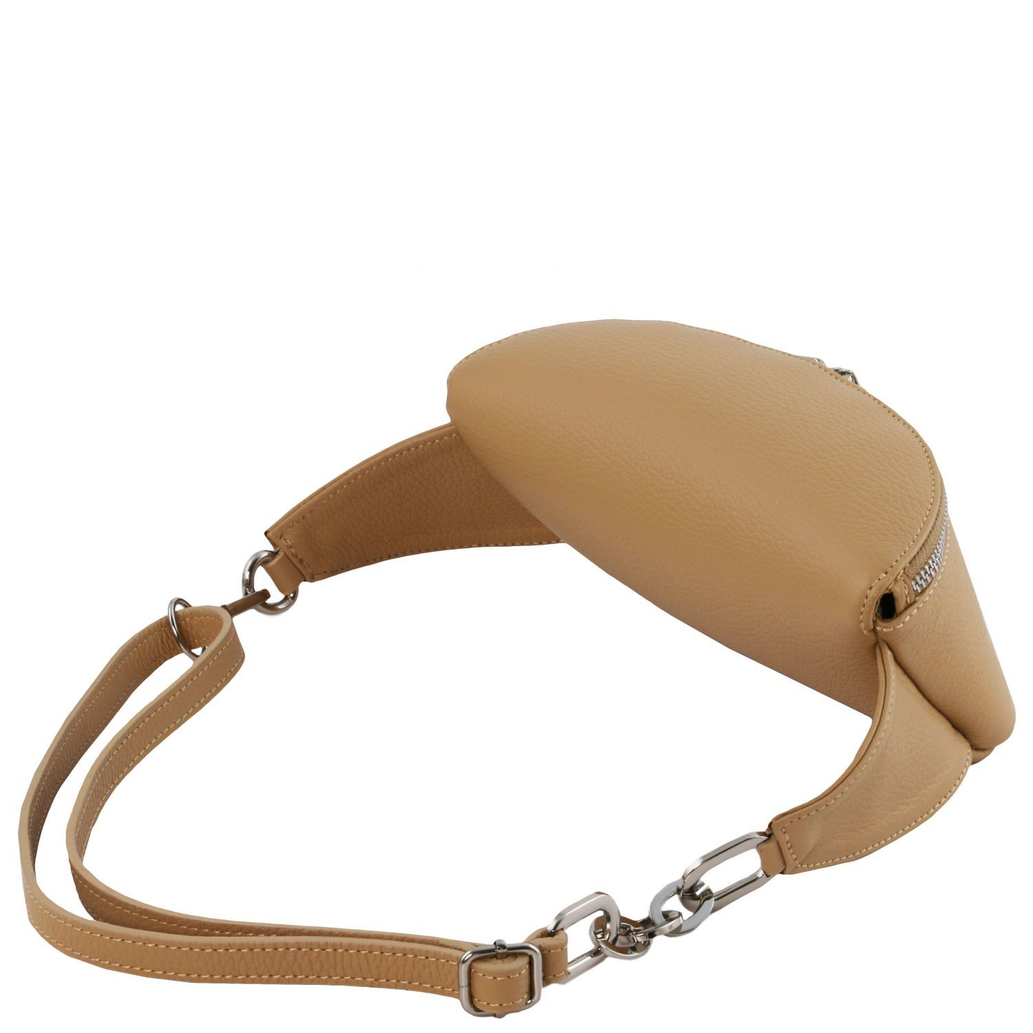 Borseta dispune de un compartiment incapator care este inchis cu un fermoar metalic. Cureaua, tot din piele, este detasabila si reglabila. Inelele de prindere ale curelei sunt din otel inoxidabil.